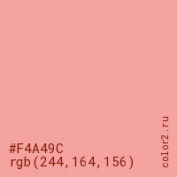 Цвет #F4A49C в цветовой модели RGB обозначается тремя октетами (244, 164, 156) в десятичном формате и #F4A49C в шестнадцатиричном (hex) формате, которые являются интенсивностью красного 244 (hex F4), интенсивность зелёного 164 (hex A4) и интенсивность синего 156 (hex 9C).