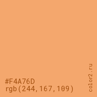 Цвет #F4A76D в цветовой модели RGB обозначается тремя октетами (244, 167, 109) в десятичном формате и #F4A76D в шестнадцатиричном (hex) формате, которые являются интенсивностью красного 244 (hex F4), интенсивность зелёного 167 (hex A7) и интенсивность синего 109 (hex 6D).