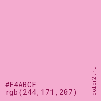 Цвет #F4ABCF в цветовой модели RGB обозначается тремя октетами (244, 171, 207) в десятичном формате и #F4ABCF в шестнадцатиричном (hex) формате, которые являются интенсивностью красного 244 (hex F4), интенсивность зелёного 171 (hex AB) и интенсивность синего 207 (hex CF).