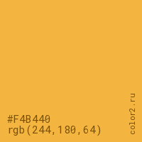 Цвет #F4B440 в цветовой модели RGB обозначается тремя октетами (244, 180, 64) в десятичном формате и #F4B440 в шестнадцатиричном (hex) формате, которые являются интенсивностью красного 244 (hex F4), интенсивность зелёного 180 (hex B4) и интенсивность синего 64 (hex 40).
