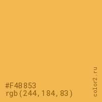 Цвет #F4B853 в цветовой модели RGB обозначается тремя октетами (244, 184, 83) в десятичном формате и #F4B853 в шестнадцатиричном (hex) формате, которые являются интенсивностью красного 244 (hex F4), интенсивность зелёного 184 (hex B8) и интенсивность синего 83 (hex 53).