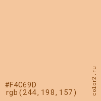 Цвет #F4C69D в цветовой модели RGB обозначается тремя октетами (244, 198, 157) в десятичном формате и #F4C69D в шестнадцатиричном (hex) формате, которые являются интенсивностью красного 244 (hex F4), интенсивность зелёного 198 (hex C6) и интенсивность синего 157 (hex 9D).