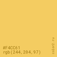 Цвет #F4CC61 в цветовой модели RGB обозначается тремя октетами (244, 204, 97) в десятичном формате и #F4CC61 в шестнадцатиричном (hex) формате, которые являются интенсивностью красного 244 (hex F4), интенсивность зелёного 204 (hex CC) и интенсивность синего 97 (hex 61).
