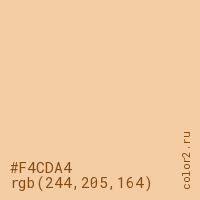 Цвет RGB(244, 205, 164) в процентом отношении количества цвета состоит из 95.7% красного (red), 80.4% зелёного (green) и 64.3% синего (blue).