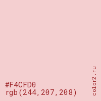 Цвет #F4CFD0 в цветовой модели RGB обозначается тремя октетами (244, 207, 208) в десятичном формате и #F4CFD0 в шестнадцатиричном (hex) формате, которые являются интенсивностью красного 244 (hex F4), интенсивность зелёного 207 (hex CF) и интенсивность синего 208 (hex D0).