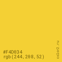 Цвет #F4D034 в цветовой модели RGB обозначается тремя октетами (244, 208, 52) в десятичном формате и #F4D034 в шестнадцатиричном (hex) формате, которые являются интенсивностью красного 244 (hex F4), интенсивность зелёного 208 (hex D0) и интенсивность синего 52 (hex 34).