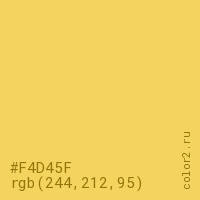 Цвет #F4D45F в цветовой модели RGB обозначается тремя октетами (244, 212, 95) в десятичном формате и #F4D45F в шестнадцатиричном (hex) формате, которые являются интенсивностью красного 244 (hex F4), интенсивность зелёного 212 (hex D4) и интенсивность синего 95 (hex 5F).