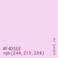 Цвет #F4D5EE в цветовой модели RGB обозначается тремя октетами (244, 213, 238) в десятичном формате и #F4D5EE в шестнадцатиричном (hex) формате, которые являются интенсивностью красного 244 (hex F4), интенсивность зелёного 213 (hex D5) и интенсивность синего 238 (hex EE).
