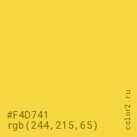 Цвет #F4D741 в цветовой модели RGB обозначается тремя октетами (244, 215, 65) в десятичном формате и #F4D741 в шестнадцатиричном (hex) формате, которые являются интенсивностью красного 244 (hex F4), интенсивность зелёного 215 (hex D7) и интенсивность синего 65 (hex 41).