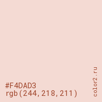 Цвет #F4DAD3 в цветовой модели RGB обозначается тремя октетами (244, 218, 211) в десятичном формате и #F4DAD3 в шестнадцатиричном (hex) формате, которые являются интенсивностью красного 244 (hex F4), интенсивность зелёного 218 (hex DA) и интенсивность синего 211 (hex D3).