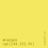 Цвет #F4E860 в цветовой модели RGB обозначается тремя октетами (244, 232, 96) в десятичном формате и #F4E860 в шестнадцатиричном (hex) формате, которые являются интенсивностью красного 244 (hex F4), интенсивность зелёного 232 (hex E8) и интенсивность синего 96 (hex 60).