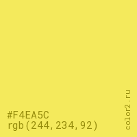 Цвет #F4EA5C в цветовой модели RGB обозначается тремя октетами (244, 234, 92) в десятичном формате и #F4EA5C в шестнадцатиричном (hex) формате, которые являются интенсивностью красного 244 (hex F4), интенсивность зелёного 234 (hex EA) и интенсивность синего 92 (hex 5C).