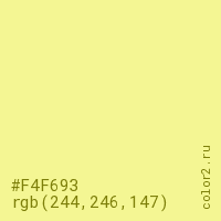 Цвет #F4F693 в цветовой модели RGB обозначается тремя октетами (244, 246, 147) в десятичном формате и #F4F693 в шестнадцатиричном (hex) формате, которые являются интенсивностью красного 244 (hex F4), интенсивность зелёного 246 (hex F6) и интенсивность синего 147 (hex 93).