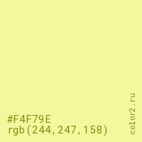 Цвет #F4F79E в цветовой модели RGB обозначается тремя октетами (244, 247, 158) в десятичном формате и #F4F79E в шестнадцатиричном (hex) формате, которые являются интенсивностью красного 244 (hex F4), интенсивность зелёного 247 (hex F7) и интенсивность синего 158 (hex 9E).