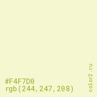 Цвет #F4F7D0 в цветовой модели RGB обозначается тремя октетами (244, 247, 208) в десятичном формате и #F4F7D0 в шестнадцатиричном (hex) формате, которые являются интенсивностью красного 244 (hex F4), интенсивность зелёного 247 (hex F7) и интенсивность синего 208 (hex D0).