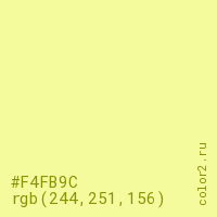 Цвет #F4FB9C в цветовой модели RGB обозначается тремя октетами (244, 251, 156) в десятичном формате и #F4FB9C в шестнадцатиричном (hex) формате, которые являются интенсивностью красного 244 (hex F4), интенсивность зелёного 251 (hex FB) и интенсивность синего 156 (hex 9C).