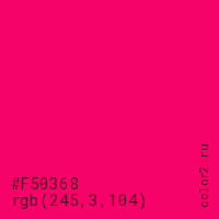 Цвет #F50368 в цветовой модели RGB обозначается тремя октетами (245, 3, 104) в десятичном формате и #F50368 в шестнадцатиричном (hex) формате, которые являются интенсивностью красного 245 (hex F5), интенсивность зелёного 3 (hex 03) и интенсивность синего 104 (hex 68).