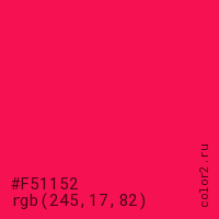Цвет #F51152 в цветовой модели RGB обозначается тремя октетами (245, 17, 82) в десятичном формате и #F51152 в шестнадцатиричном (hex) формате, которые являются интенсивностью красного 245 (hex F5), интенсивность зелёного 17 (hex 11) и интенсивность синего 82 (hex 52).