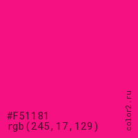 Цвет #F51181 в цветовой модели RGB обозначается тремя октетами (245, 17, 129) в десятичном формате и #F51181 в шестнадцатиричном (hex) формате, которые являются интенсивностью красного 245 (hex F5), интенсивность зелёного 17 (hex 11) и интенсивность синего 129 (hex 81).