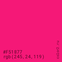 Цвет #F51877 в цветовой модели RGB обозначается тремя октетами (245, 24, 119) в десятичном формате и #F51877 в шестнадцатиричном (hex) формате, которые являются интенсивностью красного 245 (hex F5), интенсивность зелёного 24 (hex 18) и интенсивность синего 119 (hex 77).