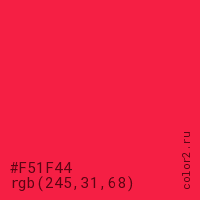 Цвет #F51F44 в цветовой модели RGB обозначается тремя октетами (245, 31, 68) в десятичном формате и #F51F44 в шестнадцатиричном (hex) формате, которые являются интенсивностью красного 245 (hex F5), интенсивность зелёного 31 (hex 1F) и интенсивность синего 68 (hex 44).
