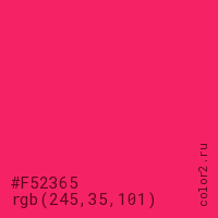Цвет #F52365 в цветовой модели RGB обозначается тремя октетами (245, 35, 101) в десятичном формате и #F52365 в шестнадцатиричном (hex) формате, которые являются интенсивностью красного 245 (hex F5), интенсивность зелёного 35 (hex 23) и интенсивность синего 101 (hex 65).