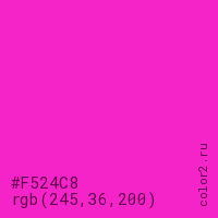 Цвет #F524C8 в цветовой модели RGB обозначается тремя октетами (245, 36, 200) в десятичном формате и #F524C8 в шестнадцатиричном (hex) формате, которые являются интенсивностью красного 245 (hex F5), интенсивность зелёного 36 (hex 24) и интенсивность синего 200 (hex C8).