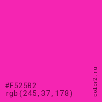 Цвет #F525B2 в цветовой модели RGB обозначается тремя октетами (245, 37, 178) в десятичном формате и #F525B2 в шестнадцатиричном (hex) формате, которые являются интенсивностью красного 245 (hex F5), интенсивность зелёного 37 (hex 25) и интенсивность синего 178 (hex B2).