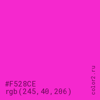 Цвет #F528CE в цветовой модели RGB обозначается тремя октетами (245, 40, 206) в десятичном формате и #F528CE в шестнадцатиричном (hex) формате, которые являются интенсивностью красного 245 (hex F5), интенсивность зелёного 40 (hex 28) и интенсивность синего 206 (hex CE).
