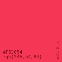 Цвет #F53654 в цветовой модели RGB обозначается тремя октетами (245, 54, 84) в десятичном формате и #F53654 в шестнадцатиричном (hex) формате, которые являются интенсивностью красного 245 (hex F5), интенсивность зелёного 54 (hex 36) и интенсивность синего 84 (hex 54).