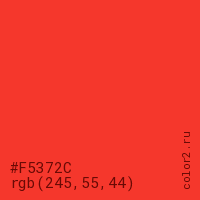 Цвет #F5372C в цветовой модели RGB обозначается тремя октетами (245, 55, 44) в десятичном формате и #F5372C в шестнадцатиричном (hex) формате, которые являются интенсивностью красного 245 (hex F5), интенсивность зелёного 55 (hex 37) и интенсивность синего 44 (hex 2C).