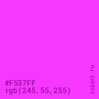 Цвет #F537FF в цветовой модели RGB обозначается тремя октетами (245, 55, 255) в десятичном формате и #F537FF в шестнадцатиричном (hex) формате, которые являются интенсивностью красного 245 (hex F5), интенсивность зелёного 55 (hex 37) и интенсивность синего 255 (hex FF).