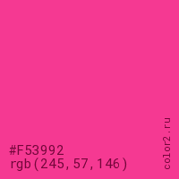 Цвет #F53992 в цветовой модели RGB обозначается тремя октетами (245, 57, 146) в десятичном формате и #F53992 в шестнадцатиричном (hex) формате, которые являются интенсивностью красного 245 (hex F5), интенсивность зелёного 57 (hex 39) и интенсивность синего 146 (hex 92).