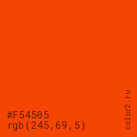 Цвет #F54505 в цветовой модели RGB обозначается тремя октетами (245, 69, 5) в десятичном формате и #F54505 в шестнадцатиричном (hex) формате, которые являются интенсивностью красного 245 (hex F5), интенсивность зелёного 69 (hex 45) и интенсивность синего 5 (hex 05).