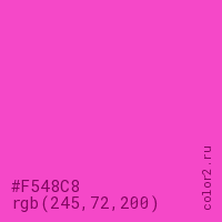 Цвет #F548C8 в цветовой модели RGB обозначается тремя октетами (245, 72, 200) в десятичном формате и #F548C8 в шестнадцатиричном (hex) формате, которые являются интенсивностью красного 245 (hex F5), интенсивность зелёного 72 (hex 48) и интенсивность синего 200 (hex C8).