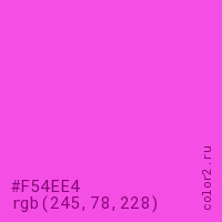 Цвет #F54EE4 в цветовой модели RGB обозначается тремя октетами (245, 78, 228) в десятичном формате и #F54EE4 в шестнадцатиричном (hex) формате, которые являются интенсивностью красного 245 (hex F5), интенсивность зелёного 78 (hex 4E) и интенсивность синего 228 (hex E4).