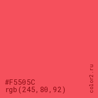 Цвет #F5505C в цветовой модели RGB обозначается тремя октетами (245, 80, 92) в десятичном формате и #F5505C в шестнадцатиричном (hex) формате, которые являются интенсивностью красного 245 (hex F5), интенсивность зелёного 80 (hex 50) и интенсивность синего 92 (hex 5C).