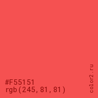 Цвет #F55151 в цветовой модели RGB обозначается тремя октетами (245, 81, 81) в десятичном формате и #F55151 в шестнадцатиричном (hex) формате, которые являются интенсивностью красного 245 (hex F5), интенсивность зелёного 81 (hex 51) и интенсивность синего 81 (hex 51).