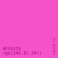 Цвет #F551C9 в цветовой модели RGB обозначается тремя октетами (245, 81, 201) в десятичном формате и #F551C9 в шестнадцатиричном (hex) формате, которые являются интенсивностью красного 245 (hex F5), интенсивность зелёного 81 (hex 51) и интенсивность синего 201 (hex C9).