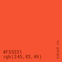 Цвет #F55331 в цветовой модели RGB обозначается тремя октетами (245, 83, 49) в десятичном формате и #F55331 в шестнадцатиричном (hex) формате, которые являются интенсивностью красного 245 (hex F5), интенсивность зелёного 83 (hex 53) и интенсивность синего 49 (hex 31).