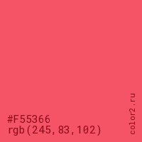 Цвет #F55366 в цветовой модели RGB обозначается тремя октетами (245, 83, 102) в десятичном формате и #F55366 в шестнадцатиричном (hex) формате, которые являются интенсивностью красного 245 (hex F5), интенсивность зелёного 83 (hex 53) и интенсивность синего 102 (hex 66).