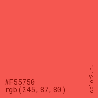 Цвет #F55750 в цветовой модели RGB обозначается тремя октетами (245, 87, 80) в десятичном формате и #F55750 в шестнадцатиричном (hex) формате, которые являются интенсивностью красного 245 (hex F5), интенсивность зелёного 87 (hex 57) и интенсивность синего 80 (hex 50).