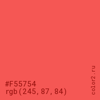 Цвет #F55754 в цветовой модели RGB обозначается тремя октетами (245, 87, 84) в десятичном формате и #F55754 в шестнадцатиричном (hex) формате, которые являются интенсивностью красного 245 (hex F5), интенсивность зелёного 87 (hex 57) и интенсивность синего 84 (hex 54).