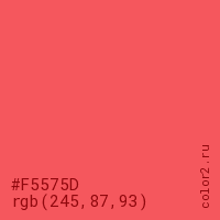 Цвет #F5575D в цветовой модели RGB обозначается тремя октетами (245, 87, 93) в десятичном формате и #F5575D в шестнадцатиричном (hex) формате, которые являются интенсивностью красного 245 (hex F5), интенсивность зелёного 87 (hex 57) и интенсивность синего 93 (hex 5D).