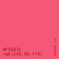 Цвет #F55876 в цветовой модели RGB обозначается тремя октетами (245, 88, 118) в десятичном формате и #F55876 в шестнадцатиричном (hex) формате, которые являются интенсивностью красного 245 (hex F5), интенсивность зелёного 88 (hex 58) и интенсивность синего 118 (hex 76).