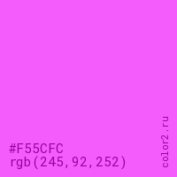 Цвет #F55CFC в цветовой модели RGB обозначается тремя октетами (245, 92, 252) в десятичном формате и #F55CFC в шестнадцатиричном (hex) формате, которые являются интенсивностью красного 245 (hex F5), интенсивность зелёного 92 (hex 5C) и интенсивность синего 252 (hex FC).