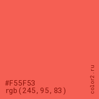Цвет #F55F53 в цветовой модели RGB обозначается тремя октетами (245, 95, 83) в десятичном формате и #F55F53 в шестнадцатиричном (hex) формате, которые являются интенсивностью красного 245 (hex F5), интенсивность зелёного 95 (hex 5F) и интенсивность синего 83 (hex 53).