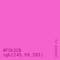 Цвет #F562CB в цветовой модели RGB обозначается тремя октетами (245, 98, 203) в десятичном формате и #F562CB в шестнадцатиричном (hex) формате, которые являются интенсивностью красного 245 (hex F5), интенсивность зелёного 98 (hex 62) и интенсивность синего 203 (hex CB).