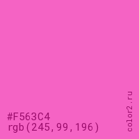 Цвет #F563C4 в цветовой модели RGB обозначается тремя октетами (245, 99, 196) в десятичном формате и #F563C4 в шестнадцатиричном (hex) формате, которые являются интенсивностью красного 245 (hex F5), интенсивность зелёного 99 (hex 63) и интенсивность синего 196 (hex C4).