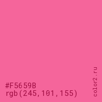 Цвет #F5659B в цветовой модели RGB обозначается тремя октетами (245, 101, 155) в десятичном формате и #F5659B в шестнадцатиричном (hex) формате, которые являются интенсивностью красного 245 (hex F5), интенсивность зелёного 101 (hex 65) и интенсивность синего 155 (hex 9B).